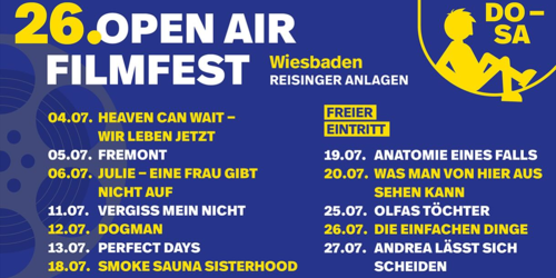 Das Open Air Filmfest Wiesbaden findet 2024 vom 04. bis zum 27. Juli statt, jeweils donnerstags, freitags und samstags bei Einbruch der Dunkelheit. Auf dem Programm stehen zwölf besondere Filme der gerade zu Ende gehenden Kinosaison: bewegende Dramen, charmante Komödien, ungewöhnliche Dokumentarfilme und passend dazu ausgewählte Kurzfilme als Vorfilm. Viele der gezeigten Filme im Programm haben ihre Kinoreise mal auf den großen, bedeutenden Filmfestivals in Berlin, Cannes, Venedig oder Locarno begonnen. In den Filmen geht es u.a. um die Schönheit des Alltags, die Tradition der nordeuropäischen Rauchsauna, die Energie, die beim gemeinsamen Singen entsteht oder die skurrilen Eigenarten einer Dorfgemeinschaft. Gleich mehrere Filme widmen sich der Selbstbestimmung und Unabhängigkeit von Frauen.