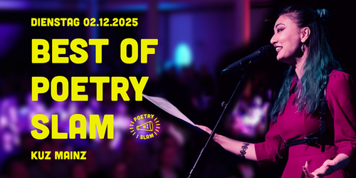 Poetry Slam bedeutet 100% gelebte Bühnenliteratur! Hier treffen sich hier Performance-Text und Poesie, witzige Alltagsgeschichte und stilles Gedicht, literarischer Rock ’n’ Roll und hochpoetische Verdichtung. Die Regeln sind denkbar einfach: 10 Minuten Zeitlimit, 4 Poet*innen, 1 Mikrofon für alle: rasant, hochunterhaltsam, kurzweilig und immer am Puls der Zeit. Ein Abend für Poetry Slam Gourmets und alle, die es werden wollen.