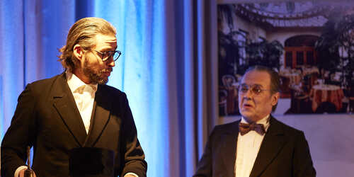 Vorhang auf! Endlich, ist es so weit! Nach dreijähriger Bauzeit eröffnet das Palasthotel in Wiesbaden. Nur die Crème de la Crème ist geladen. Stolz begrüßt der findige Hoteldirektor Otto Schick seine Gäste! Franz der Hotelbursche, fegt die letzten Blätter vom neuen Kunstrasen und trägt die Koffer ins Foyer. Wir befinden uns im Jahr 1905, in Wiesbaden dem Nizza des Nordens. Otto Schick (Wolfgang Vielsack) lässt die Korken knallen und lädt zum Cocktail (im Eintrittspreis enthalten).